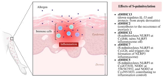 Effects of protein S-palmitoylation on inflammatory dermatosis. zDHHC 13 [11], zDHHC 2 [12], zDHHC 12 [37], zDHHC 7 [31], and zDHHC 5 [33,34,35] have been verified to impact inflammatory dermatosis through different pathways. This figure was created in Biorender Feng, Y.H. (2025) https://app.biorender.com/ (accessed on 16 September 2025).