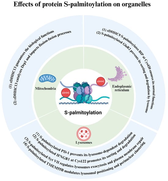 Effects of protein S-palmitoylation on organelles. (1) Mitochondria: zDHHC13 guarantees the biological functions; zDHHC13 catalyzes Drp1 and impacts fission-fusion processes [61,62]. (2) Endoplasmic Reticulum: zDHHC9 S-palmitoylates BIP at Cys420 ensures its normal functions [63]; S-palmitoylated GluR2 prevents its sorting and degrdation by lysosome [64]. (3) Lysosomes: S-palmitoylated TMEM55B modulates lysosomal positioning and perinuclear clustering [65]; S-palmitoylated Syt VII regulates lysosomes exocytosis and plasma membrane repair [66]; S-palmitoylated IFNGR1 at Cys122 promotes its sorting and degradation [67]; S-palmitoylated PD-1 prevents its lysosome-dependent degradation [68]. This figure was created in Biorender Feng, Y.H. (2025) https://app.biorender.com/ (accessed on 16 September 2025).