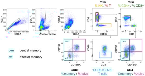 Figure 1. Scheme of the gating strategy for the determination of cell subpopulations by flow cytometry. PBMC were stained with the Fixable Viability Dye Zombie Yellow and for the indicated markers. NK and T-cells were separated by CD3 and CD56. T helper cells and cytotoxic T-cells were identified by CD4 and CD8 expression, respectively. Within CD8+ and CD4+ T-cells, naïve, central and effector memory cells were separated by CD45RA and CD197 staining. CD28− cells were sub-gated from CD8+ T-cells.