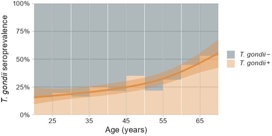 Figure 2. Percentage distribution of T. gondii seropositive (T. gondii+) and seronegative (T. gondii−) participants in relation to age binned in 5-year intervals, overlaid with spline regression predictions and 95% confidence band of T. gondii+ prevalence depending on age fitted by generalized additive models.