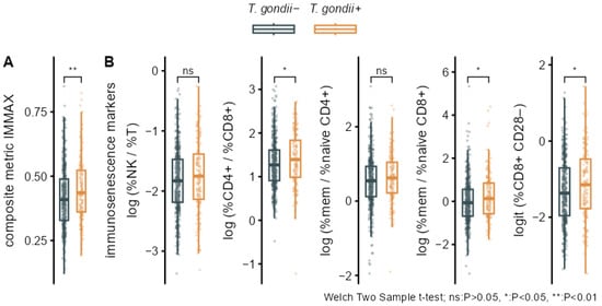 Figure 3. Bivariate associations of T. gondii status with immunosenescence biomarkers. Boxplots overlaid with individual data comparing T. gondii+ and T. gondii− with p-values from Welch two-sample t-tests for (A) the composite immune age metric IMMAX and (B) the single immunosenescence biomarkers.