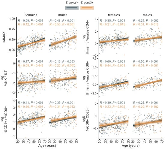 Figure 4. Age trends of the composite immune age metric IMMAX and single immunosenescence biomarkers in T. gondii+ and T. gondii− subgroups stratified by sex with Pearson correlation coefficients (R) and p-values, regression lines and 95% confidence bands.