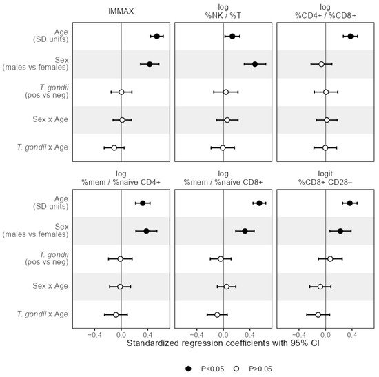 Figure 5. Effect sizes as standardized regression coefficients with 95% CI of the predictors age, sex, T. gondii status and the interaction terms denoted by the separator ‘x’ of age with sex and T. gondii status, respectively, from linear regression models predicting the composite immune age metric IMMAX and single immunosenescence biomarkers, respectively. Vertical reference lines indicate null effects and filled symbols mark statistically significant (p < 0.05) effects, respectively.