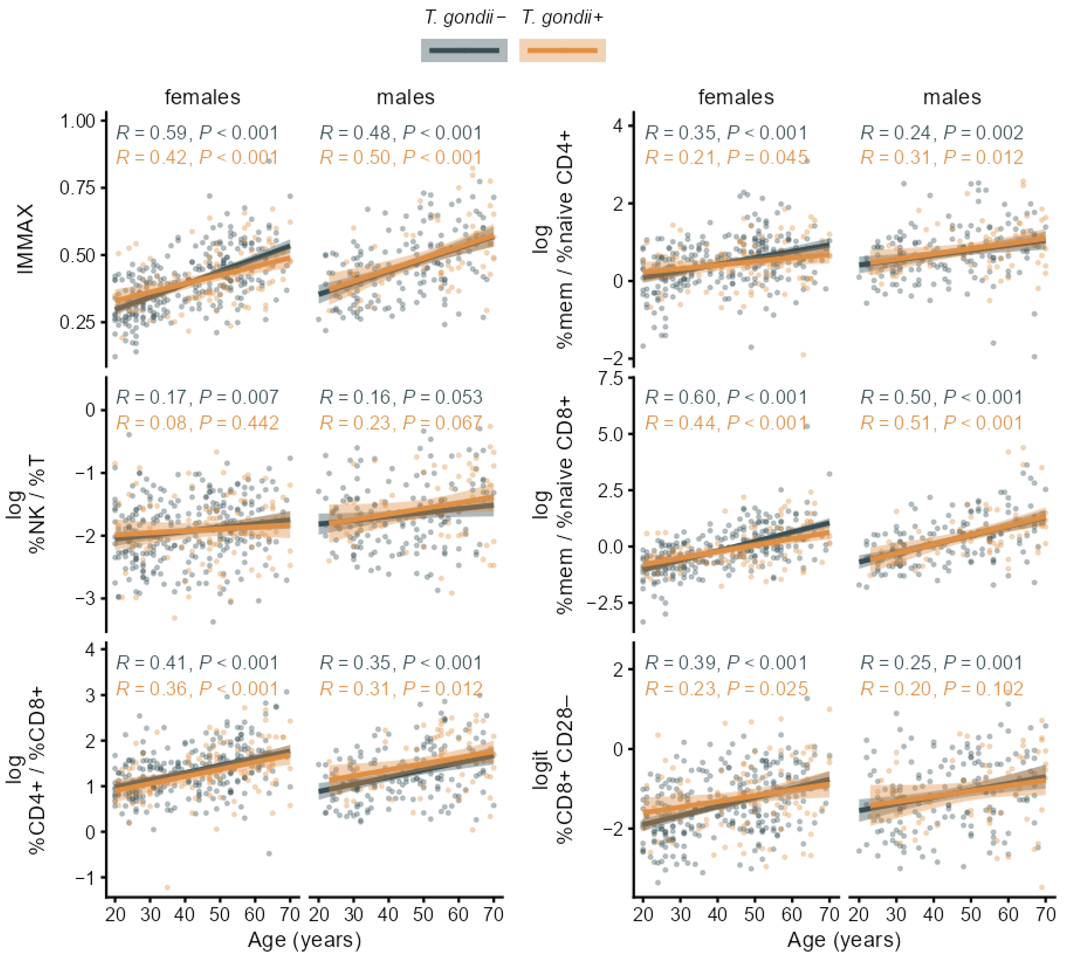 Bröde, P.; Claus, M.; Getzmann, S.; Golka, K.; Hengstler, J.G.; Reinders, J.; Wascher, E.; Watzl, C.; Gajewski, P.D. Latent Toxoplasma gondii Infection Does Not Modulate Immune Aging in a Cross-Sectional Working-Age Population Study. Biomolecules 2026, 16, 55. https://doi.org/10.3390/biom16010055