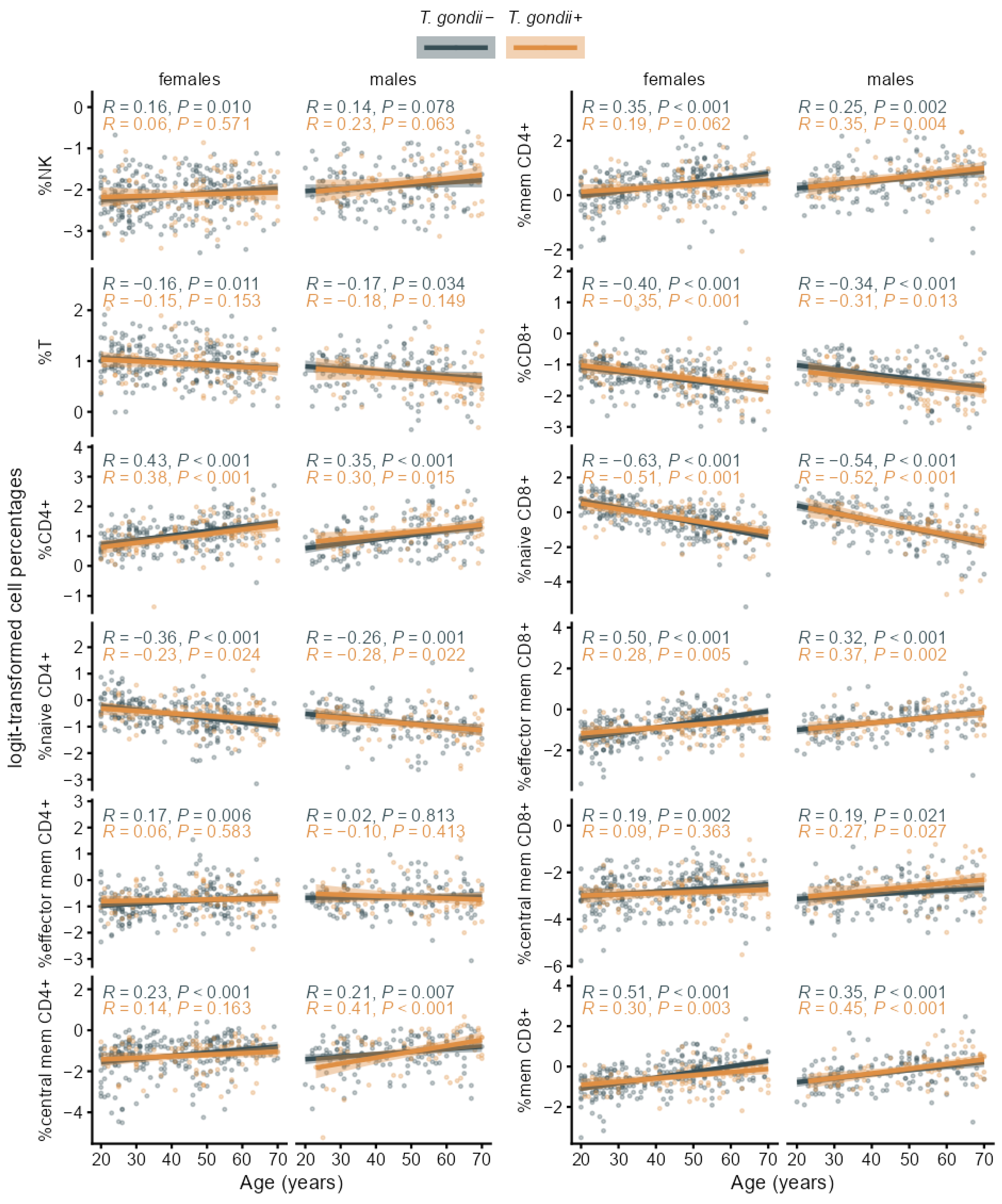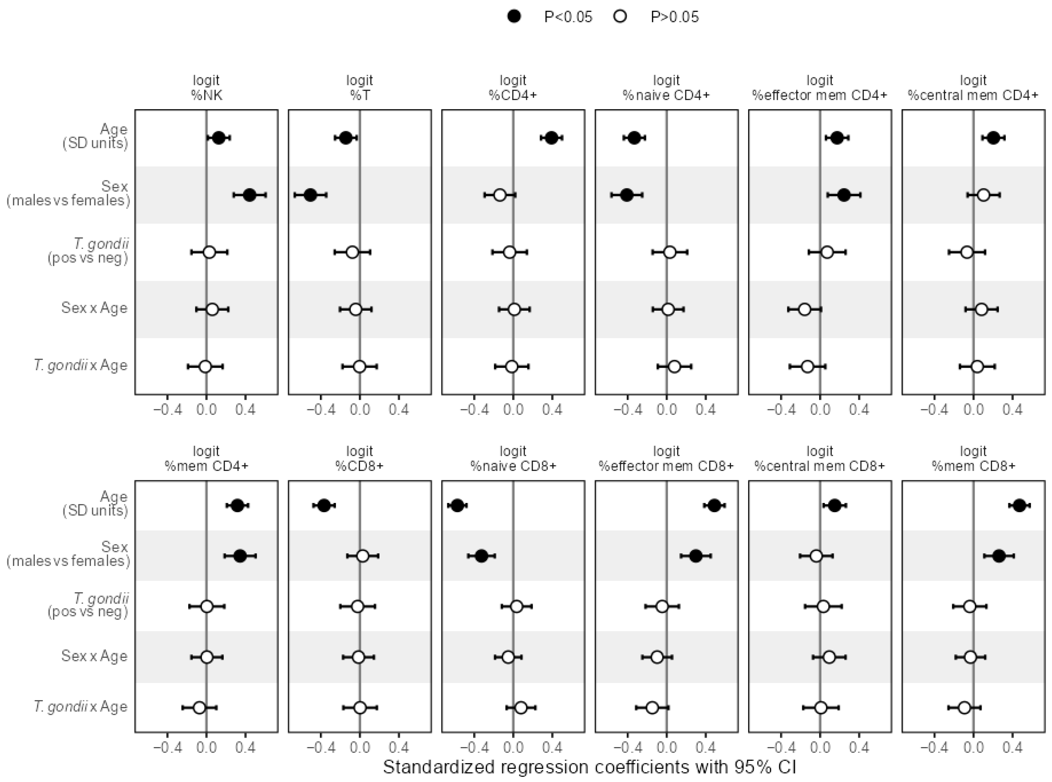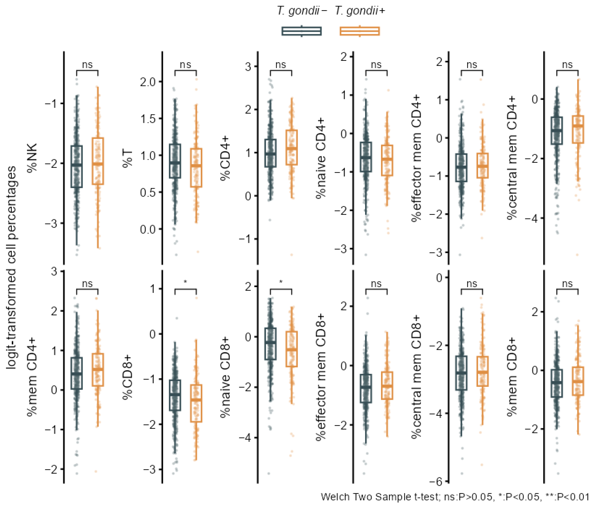 | Logit-Transformed Cell Percentages | T. gondii− N = 423 1 | T. gondii+ N = 161 1 | P 2 | q-Value 2 | ∆adj (95% CI) 3 | Padj 3 |