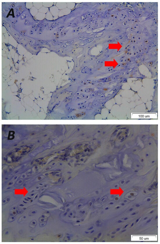Figure 4. Representative photomicrographs of immunohistological staining from vertebral end plate sections received after asymmetrical loading at the spine of a rat animal experimental model demonstrating that mechanical loading results in disorientated endplates (original magnification 20×) (A) that express the osteoblastic growth factor Pleiotrophin in the nucleus and cytoplasm of hypertrophic chondrocytes (red arrows) leading to primary ossification, wedged vertebrae and kyphotic malformation (original magnification 40×) (B). Please note the morphological changes and altered orientation of the hypertrophic chondrocytes. The figure is from the corresponding author’s experimental data and illustrates the pathological results of the vertebral endplates after asymmetric loading at the sagittal plane of the spine.