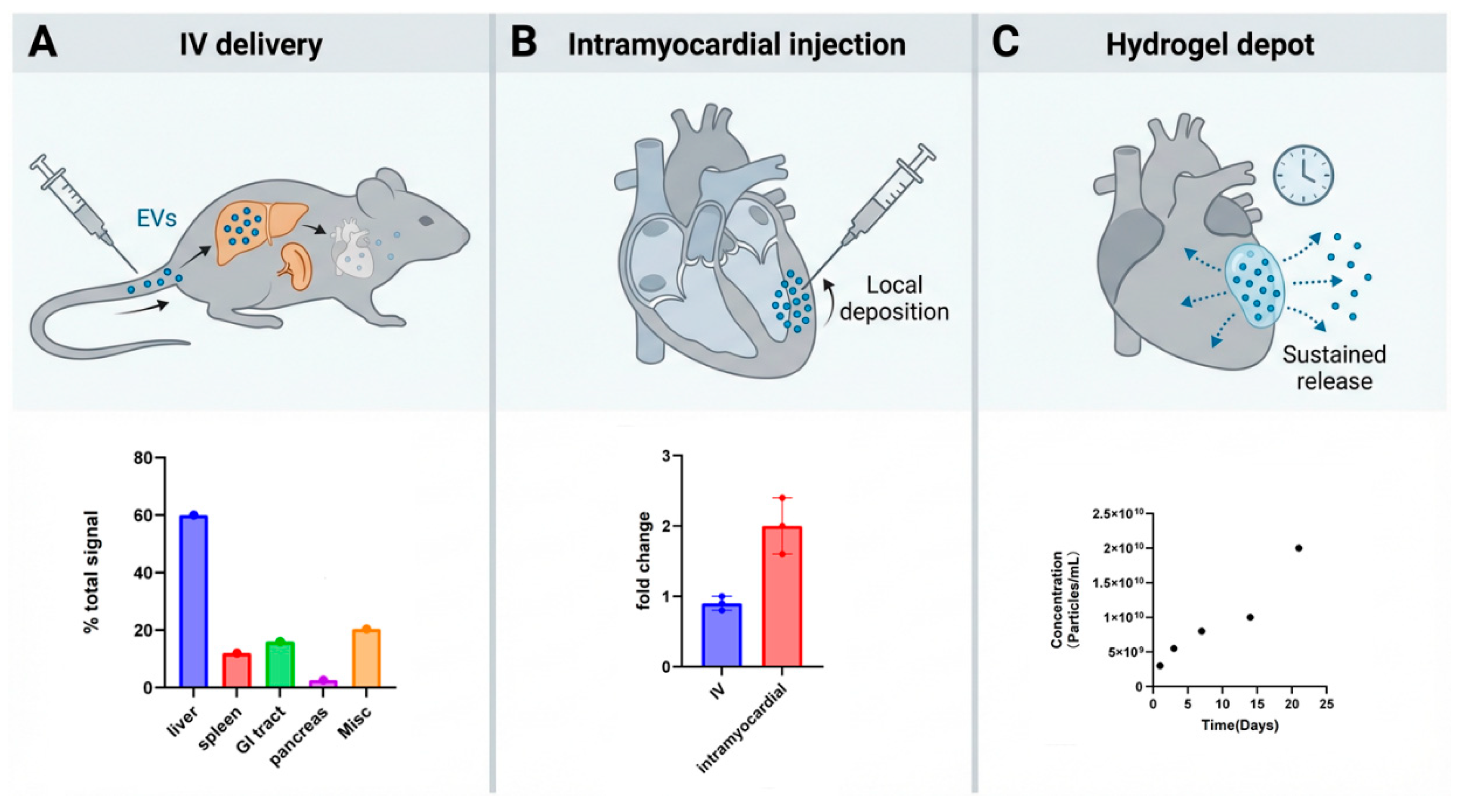 | EPC-EVs | shear-thinning hydrogel–based local delivery; sustained release/retention | IM (local myocardial injection) | Rat MI | enhanced angiogenesis; improved cardiac function; increased EV retention | [29] |