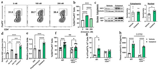 To investigate the effect of celastrol in Treg induction and function, we analyzed CD4+Foxp3+ Treg differentiation and IL-10 production in wild-type (WT) and HSF1fl/fl-CD4cre T cells. Flow cytometry analysis (Figure 1a,b) shows that celastrol significantly increases the percentage of CD4+Foxp3+ Tregs at 100 nM, whereas higher concentrations (200 nM) result in a decline, consistent with reduced Treg fitness at elevated doses [34]. Western blot analysis (Figure 1c) demonstrates celastrol-induced HSF1 cytoplasmic activation and nuclear translocation, suggesting its role in transcriptional regulation. Western blot original images can be found in Supplementary Materials. Luciferase assays (Figure 1d,e) confirm that celastrol enhances HSF1 binding to the heat shock element (HSE) promoter region and increases Foxp3 promoter activation. However, HSF1-deficient Tregs display reduced Foxp3 expression overall, but celastrol still produces a modest and statistically significant increase, albeit markedly lower than the response observed in WT Tregs (Figure 1f). In addition, HSF1-deficient Tregs exhibit reduced IL-10 production (Figure 1g,h), suggesting that celastrol-induced Treg functionality is partly HSF1-dependent. These findings indicate that HSF1 activation is critical for celastrol-mediated Treg differentiation and immunosuppressive function.