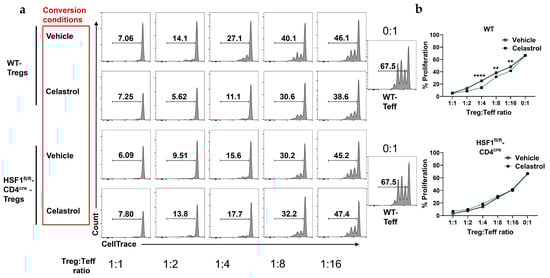 First, to determine whether celastrol independently affects Teff in the absence of Tregs, we treated purified Teff cells with increasing concentrations of celastrol (0, 50, 100, 200, and 300 nM). Our result showed that celastrol reduced Teff viability in a dose-dependent manner (Figure S1). Next, to evaluate the functional capacity of Tregs, we performed a Treg:Teff suppression assay using Tregs from WT and HSF1fl/fl-CD4cre mice after in vitro conversion in the presence or absence of celastrol. These converted Tregs were then co-cultured with CellTrace-labeled Teff cells. Flow cytometry histograms (Figure 2a) illustrate Teff proliferation across Treg:Teff ratios under vehicle or 100 nM celastrol treatment. In WT Tregs, celastrol markedly enhanced suppressive activity, evidenced by a significant reduction in Teff proliferation. Quantification of proliferation (Figure 2b) confirmed that celastrol-treated WT Tregs suppressed Teff expansion more effectively than vehicle controls. In contrast, HSF1-deficient Tregs (HSF1fl/fl-CD4cre) failed to exhibit this celastrol-induced enhancement, showing no difference between vehicle- and celastrol-treated groups. Together, these findings demonstrate that celastrol enhances Treg-mediated suppression in an HSF1-dependent manner, indicating that HSF1 is required for celastrol-induced Treg functionality.