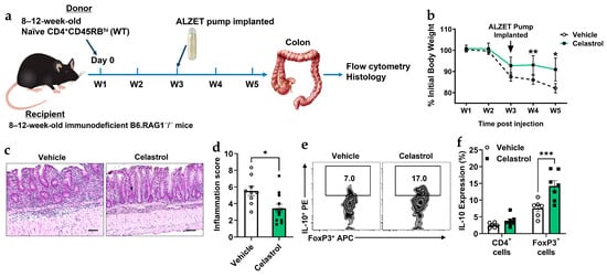 A recent study demonstrated that celastrol protects mice from developing colitis [41]. In this study, we used an adoptive transfer colitis model in B6 RAG1−/− mice to investigate the role of Tregs in the presence or absence of celastrol. Naïve CD4+CD45RBhi (WT) were introduced to these immunodeficient mice, which lack B and T cells. To evaluate the therapeutic effect of celastrol in a murine colitis model, we analyzed body weight changes, histological inflammation, and IL-10 expression in response to the induced colitis (Figure 3a). Body weight measurements (Figure 3b) show that celastrol treatment prevents weight loss compared to vehicle-treated mice, particularly after pump implantation. Histological analysis of colonic tissues (Figure 3c,d) reveals a significant reduction in inflammation scores in celastrol-treated mice. Moreover, flow cytometry analysis (Figure 3e,f) demonstrates that celastrol increases IL-10 production in FoxP3+ Tregs, indicating an enhanced immunosuppressive function of Tregs. Collectively, these findings suggest that celastrol protects against colitis by increasing Treg-mediated IL-10 production and reducing intestinal inflammation.