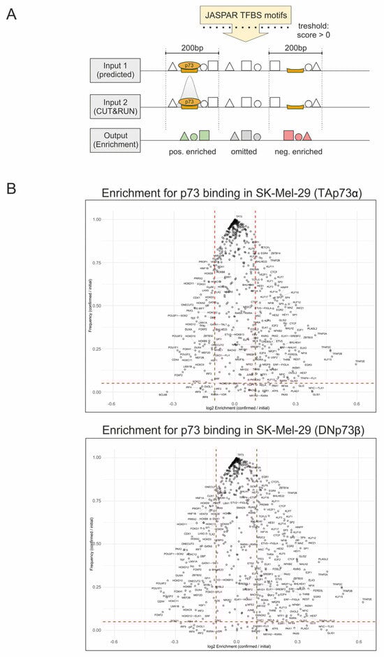 Figure 2. Genome-wide Enrichment Analysis of Transcription Factor Co-Localization at p73 Binding Sites. (A) Overview of the analysis strategy: 608 JASPAR-derived transcription factor binding sites (TFBS) were mapped to the human genome, generating two inputs. Input 1 contains all predicted TFBS, including the p73 motif. Input 2 contains all predicted TFBS, as well as the CUT&RUN-confirmed p73 sites. Subsequently, the enrichment was calculated as log2 ratio of the indicated inputs within a ±100 bp window around the p73 sites and plotted against the motif frequency. (B) Swarm plot of TFBS enrichment at confirmed p73 binding sites for TAp73α (top) and DNp73β (bottom). Dashed red lines indicate the significance threshold values: log2 Enrichment ENR > 0.1, Frequency (F) > 0.05. ENR enrichment; F Frequency.