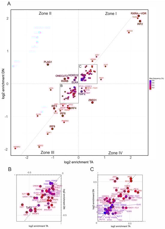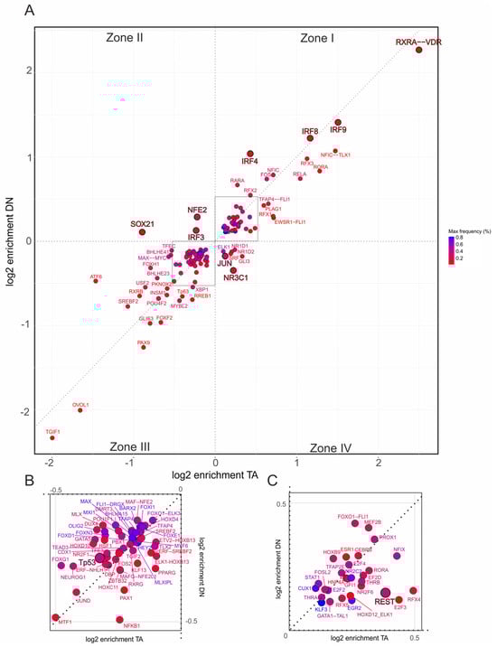 Figure 5. Promoter-specific motif enrichment within the inflammatory response hallmark gene set. (A) Two-dimensional scatterplot showing log2 enrichment of TF binding site motifs at CUT&RUN-confirmed TAp73α (x-axis) and DNp73β (y-axis) peaks located in the 500 bp promoter regions of hallmark genes. Motifs are classified into four zones: Zone I—shared motifs with isoform bias (above diagonal: DN-preferred; below diagonal: TA-preferred); Zone II—DNp73β-specific; Zone III—depleted in both isoforms; Zone IV—TAp73α-specific. (B,C) Insets show magnified regions from panel (A), highlighting motifs depleted in both isoforms (B) or co-enriched by both isoforms (C), facilitating interpretation of less prominent but potentially relevant cofactors. Each dot represents one motif; color intensity reflects motif frequency near p73 peaks (±100 bp), providing a measure of both abundance and enrichment.