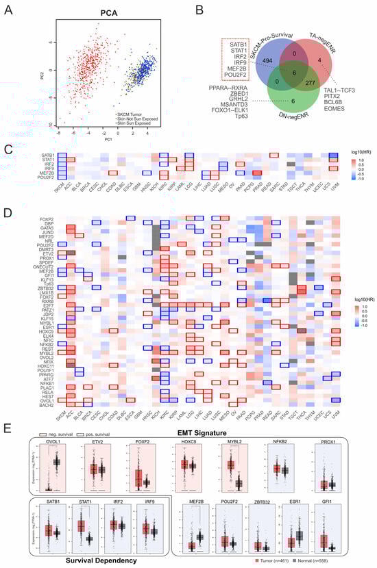 Figure 7. Survival dependency of EMT-associated coTFs. (A) Principal component analysis of p73-associated EMT cofactors separates melanoma samples (red) from healthy skin, including sun-exposed (blue) and non–sun-exposed (brown) subgroups. PC1 (x-axis) and PC2 (y-axis) represent the first and second principal components derived from log2(TPM + 1) expression values. (B) Venn diagram illustrating the overlap between genes with the strongest positive impact on survival in SKCM and coTF motifs negatively enriched for TAp73α and DNp73β. Relevant factors (motifs) are indicated. (C) Heatmap depicting the survival dependency of TAp73α- and DNp73β–common negatively enriched coregulators identified in (B) across melanoma (SKCM) and other cancer types. (D) Heatmap showing the survival dependency of EMT-associated factors (from Figure 6C) across cancer types (x-axis, TCGA abbreviations). Colors indicate hazard ratios (HR), with blue representing high expression linked to improved survival and red indicating high expression associated with poor survival. (E) Analysis of expression patterns of survival (C) and EMT-related genes (D) in tumor samples (red boxes) vs. healthy tissue (grey boxes). Red/blue shading indicates poor/good prognosis associated with the genes. * p < 0.05.