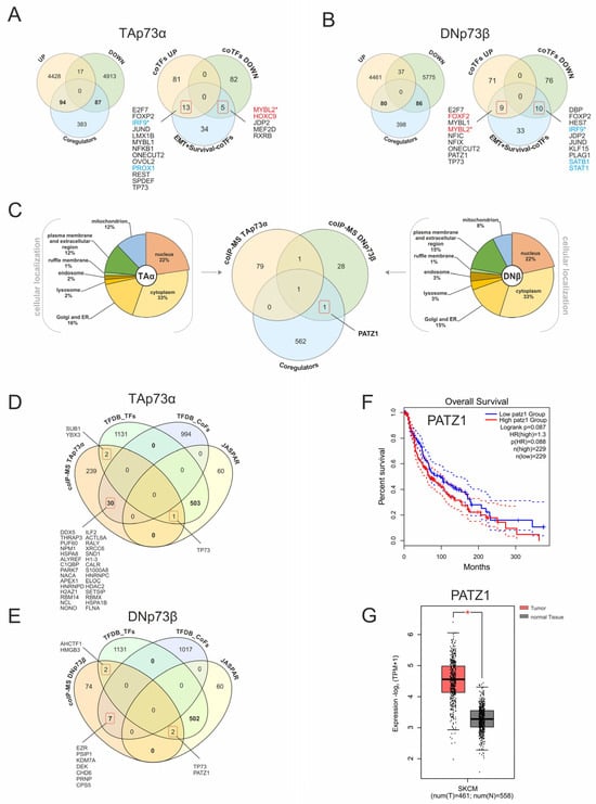 Figure 8. Isoform-specific transcriptomic and proteomic landscapes of p73 coregulators reveal PATZ1 as a DNp73β interactor. (A,B) Comparative analysis of expression data for TAp73α (A) and DNp73β (B) with CUT&RUN-confirmed coTFs, EMT signature genes, and survival-dependency genes. A total of 564 unique factors were compiled after removal of duplicates, as several JASPAR-derived motifs correspond to the same transcription factor. Genes associated with negative survival are highlighted in red, while prosurvival genes are shown in blue. Asterisks highlight the genes oppositely regulated by both p73 isoforms. (C) Cellular localization and overlap of nuclear-localized proteins identified by CoIP-MS with TAp73α and DNp73β. The Venn diagram illustrates the overlap between CoIP-MS-detected candidates and predicted coregulators. (D,E) Comparison of TFDB-annotated transcription factors and cofactors with JASPAR-derived factors and CoIP-MS–identified interactors. (F) Kaplan–Meier survival plot of PATZ1 expression in melanoma patient samples. (G) PATZ1 expression levels in TCGA skin cancer (SKCM) dataset. Solid lines represent the survival curves, while dashed lines indicate the 95% confidence intervals for each group. * p < 0.05.