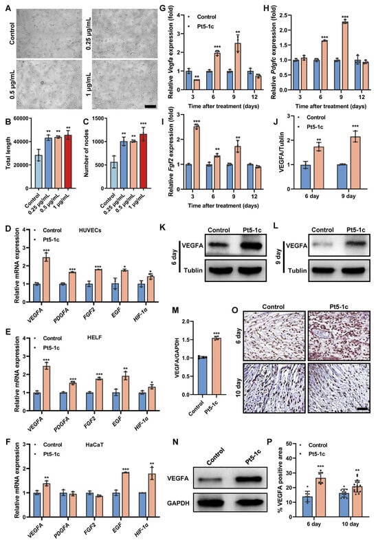 Tube formation assay revealed that compared with control, Pt5-1c caused a marked increase in the total capillary length and number of nodes (p < 0.01, Figure 2A–C), suggesting it has the capacity to induce tube formation in endothelial cells. Therefore, we next examined the effect of Pt5-1c on the expression of key angiogenic growth factors in HUVECs, HaCaT, and HELF cells at a concentration of 1 μg/mL, which was found to be optimal for its pro-angiogenic activity [44]. It was found that treatment with Pt5-1c upregulated the expression of VEGFA, PDGFA, FGF2, EGF, and HIF-1α (hypoxia-inducible factor-1α) in both HUVECs and HELF cells (Figure 2D,E). Similarly, Pt5-1c was also shown to induce an increase in the expression of VEGFA, EGF, and HIF-1α in HaCaT cells, though little difference was observed in the expression of PDGFA or FGF2 in comparison with control (Figure 2F). In agreement with the results above, Pt5-1c administration also significantly enhanced the expression of Vegfa (p < 0.01; Figure 2G), Pdgfc (p < 0.001; Figure 2H), and Fgf2 (p < 0.01; Figure 2I) in a murine full-thickness wound model. Moreover, both Western blot and immunohistochemical analysis demonstrated that Pt5-1c treatment significantly increased the synthesis of VEGFA protein in vitro (Figure 2M,N) and in vivo (Figure 2J–L,O,P). Collectively, these suggest that Pt5-1c is able to promote the tube formation via upregulating the expression of critical pro-angiogenic growth factors.