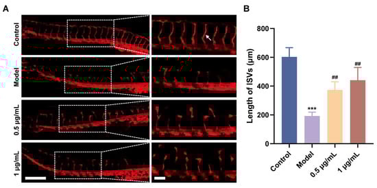 The Tg (flk: mCherry) zebrafish line was used to establish the vascular deficiency model by PTK787, which has been shown to impair angiogenesis by blocking the autophosphorylation of VEGFR and inhibiting endothelial cell proliferation [17]. The ISVs were detected and photographed under laser confocal microscopy. It was observed that compared with control, angiogenesis of ISVs in the model zebrafish was considerably inhibited by treatment with PTK787, and the length of ISVs was decreased by 68% (Figure 3A,B). By contrast, administration of Pt5-1c could reverse the PTK787-induced vascular defects of zebrafish in a dose-dependent manner and remarkably restored the angiogenesis and length of ISVs (p < 0.01), with a recovery rate of more than 60% at 1 μg/mL of Pt5-1c (Figure 3A,B). These showed that Pt5-1c can restore the formation and growth of ISVs in zebrafish with vascular defects, further confirming the presence of pro-angiogenic activity of Pt5-1c.