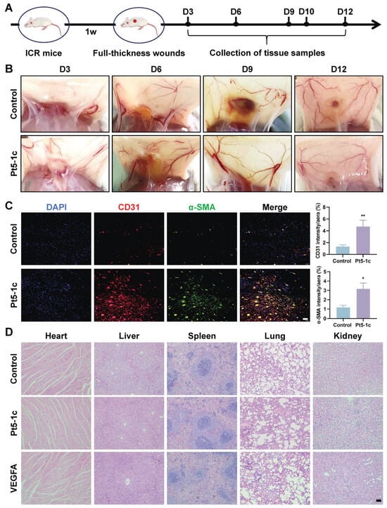 Figure 4. Pt5-1c enhanced angiogenesis in wound sites. (A) Schematic diagram of wound healing in mice using antimicrobial peptide Pt5-1c; (B) Representative images of blood vessels of the wounds at days 3, 6, 9, and 12 post wounding in the mice treated with Pt5-1c (10 μg/mL) or sterile saline (control); (C) Representation and quantification of immunostaining for CD31 or α-SMA-positive vessels at day 9 post-wounding in the mice treated with Pt5-1c (10 μg/mL) or sterile saline (control). Scale bar: 50 μm; (D) H&E staining images of the heart, liver, spleen, lung, and kidneys of rats after treatment with Pt5-1c for 12 days. Scale bar: 100 μm. Data are shown as means ± SEM (n = 3), * p < 0.05, ** p < 0.01, compared with control group.