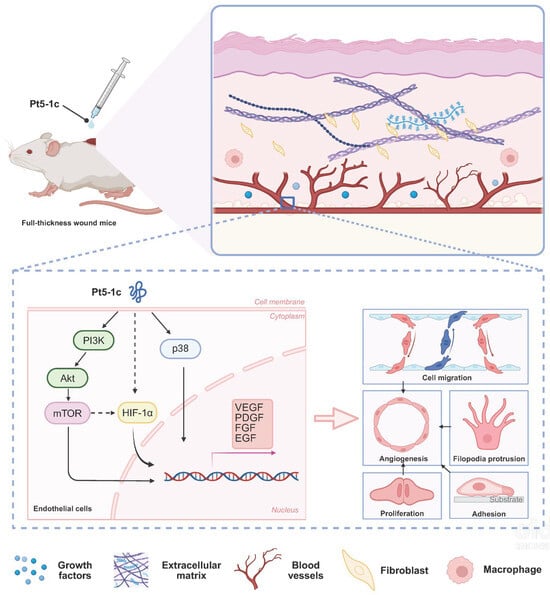 Pt5-1c has pro-angiogenic activity both in vitro and in vivo, promoting our investigation into its underlying mechanism to assess its broader therapeutic potential. Our results show that increased phosphorylation of AKT, mTOR, and p38 occurs within minutes of Pt5-1c treatment, and pharmacological inhibition of PI3K/AKT/mTOR and p38 MAPK pathways abrogates migratory and tube-forming responses. Previous studies found that in the wounded skin of mice, the expression of p-PI3K and p-AKT was regulated to peak during the inflammatory and proliferation phase [52]. Activating PI3K/AKT/mTOR signaling pathway is beneficial for normal and chronic wound repair as it mediates cell proliferation, migration, apoptosis, and collagen deposition during healing [52]. Similarly, p38 MAPK pathways are central to endothelial cell survival, growth, and motility [17,53], and has been reported to play a vital role in postischemic neuroprotection and neurodisorder tolerance phenomena [54]. Moreover, molecular docking reveals potential binding interactions between Pt5-1c and PI3K, AKT, mTOR, and p38, offering a structural basis for its pro-angiogenic activity. These suggest that Pt5-1c promotes endothelial cell motility, growth and survival via activation of key signaling cascades including PI3K/AKT/mTOR and p38 MAPK pathways, although whether it affects the half-life of these kinases remains to be determined. Another interesting finding of our study is that Pt5-1c upregulates expression of HIF-1α, a master transcriptional regulator of angiogenesis. It has been documented that HIF-1 can enhance VEGF transcription via binding to hypoxia-responsive elements, and HIF-1-mediated VEGF signaling coordinates vascularization with other regenerative processes such as neurogenesis [55]. It is thus also possible that Pt5-1c can initiate angiogenesis through HIF-1-VEGF axis activation, though further study is still needed. Emerging evidence highlights a complex crosstalk between the mTOR and HIF-1α pathways, forming a self-reinforcing positive feedback loop [56]. Therefore, mechanistically we propose that Pt5-1c activates both PI3K/AKT/mTOR and p38 MAPK pathways as well as the HIF-1-VEGF axis simultaneously or sequentially, which in turn collectively stimulates a concerted generation of major pro-angiogenic factors including VEGF, PDGF, FGF and EGF that then trigger cell migration, adhesion, proliferation and growth, eventually enhancing angiogenesis (Figure 6). However, whether Pt5-1c initiates these signals by binding to a specific receptor remains an important question for further research.