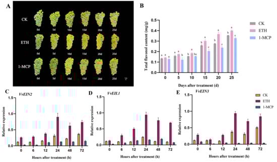 Exogenous ethylene promotes the biosynthesis of total flavonols in grape berry skin. (A) Photos of ‘Chardonnay’ grape fruits from 0 d to 25 d after treatment; (B) total flavonol contents at 0 d to 25 d after treatment; (C–E) relative expression levels of key genes VvEIN2, VvEIL1, and VvEIN3 involved in the ethylene signal transduction pathway. Different lowercase letters indicate significant differences (p < 0.05).