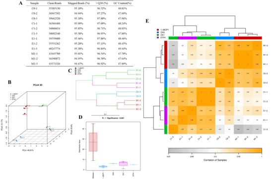 Analysis of transcriptome sample data quality. (A) Transcriptome sample data quality; (B) principal coordinate analysis (PCoA) plot; (C) hierarchical clustering diagram; (D) anosim inter-group similarity analysis box plot; (E) heatmap for inter-sample correlation analysis.