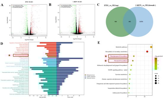 Differential gene screening affecting flavonol biosynthesis. (A) Volcano plot of ETH1 vs. CK1 expression differences; (B) volcano plot of 1-MCP1 vs. CK1 expression differences; (C) Venn diagram of ETH1 vs. CK1 (up) and 1-MCP1 vs. CK1(down&-) co-expression; (D) GO enrichment analysis; (E) KEGG enrichment analysis. Red star marks pathway related to flavonols.