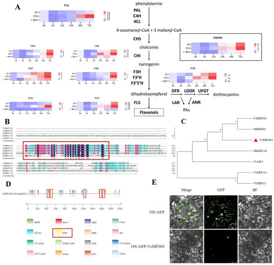 Differential gene screening affecting flavonoid biosynthesis. (A) Expression levels of genes related to the flavonoid biosynthesis pathway; (B) alignment of conserved domains; (C) phylogenetic tree of ERF transcription factors; (D) analysis of cis-acting elements in the promoter of VvERF003; (E) subcellular localization of VvERF003. The red box represents the ethylene responsive elements.