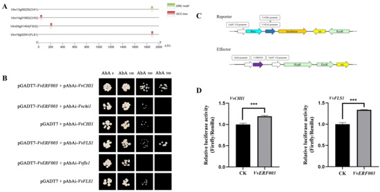 VvERF003 directly combined to and activated the VvFLS1 and VvCHI1 promoters. (A) Analysis of cis-acting elements in the promoters of flavonoid biosynthesis pathway-related genes; (B) yeast one-hybrid assay to verify the binding of VvERF003 to the VvFLS1 and VvCHI1 promoters, respectively; (C) schematic diagram of the dual-luciferase reporter system, including the effector and reporter constructs; (D) double-luciferase assay was used to detect the luciferase activity of VvERF003 co-expressed with the promoters of VvFLS1 and VvCHI1, respectively. The asterisk represents significant difference (*** p < 0.001).