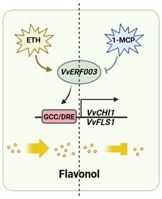 ERFs belong to the AP2/ERF superfamily and carry the AP2/ERF domain. The superfamily could be further divided into the AP2 family, ERF family, and RAV family [24]. ERF transcription factors could recognize and bind to the GCC box (A/GCCGCC) and DRE motif (G/ACCGAC) in the downstream gene promoter, thereby activating its expression [7,25]. In grape, VvERF75 could positively regulate their expression by combining with the DRE motif in the promoters of pheophorbide oxylase (VvPAO1) and 1-aminocyclopropane-1-carboxylic acid synthase (VvACS5) [26]. Apple MdAP2-34 activated its expression by directly binding to the DRE motif-acting element on the MdF3’H promoter, thereby promoting flavonoid biosynthesis [27]. In this study, the promoters of VvCHI1 and VvFLS1 contained a DRE motif and a GCC box, respectively. The Y1H and double-luciferase experiments verified that VvERF003 could bind to it and activate its expression. In conclusion, our study found that exogenous ethylene promoted the expression of VvERF003, contrasting with 1-MCP, which subsequently led to flavonol accumulation by directly binding to and activating the promoters of VvCHI1 and VvFLS1 (Figure 7). Additionally, the expression of other flavonol-related structural genes may be modulated by other transcription factor genes following ethylene treatment.