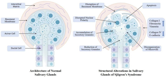 SG structural disruption in SS: normal vs. pathological features. This figure contrasts normal SGs architecture with pathological alterations in Sjögren’s syndrome. Normal SGs exhibit intact nuclear polarity, organized microvilli, continuous basement membrane, and balanced secretory granule dynamics within a structured ECM. In contrast, diseased glands display disrupted nuclear polarity, disorganized microvilli, increased apoptosis, aberrant accumulation or depletion of secretory granules, fragmented basement membrane, and ECM remodeling characterized by collagen deposition and laminin degradation. These structural defects impair secretory function, exacerbate inflammation–fibrosis crosstalk, and ultimately lead to irreversible gland dysfunction and xerostomia.