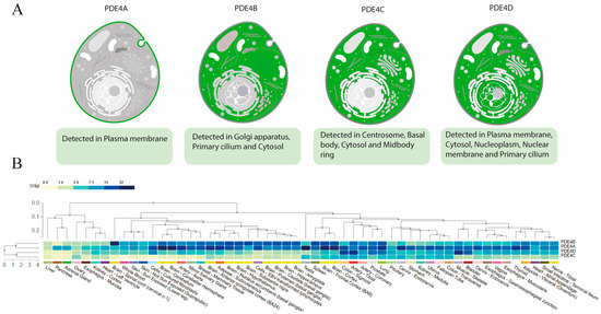 (A) Subcellular expression patterns for PDE4 isoforms, obtained from The Human Protein Atlas. Data available at: https://www.proteinatlas.org/ENSG00000184588-PDE4B/subcellular (accessed on 5 November 2025). (B) Tissue expression levels of the PDE4 isoforms, obtained through a multigene query in the GTEx Portal (GTEx Consortium), available at https://gtexportal.org/home/multiGeneQueryPage (accessed on 5 November 2025).
