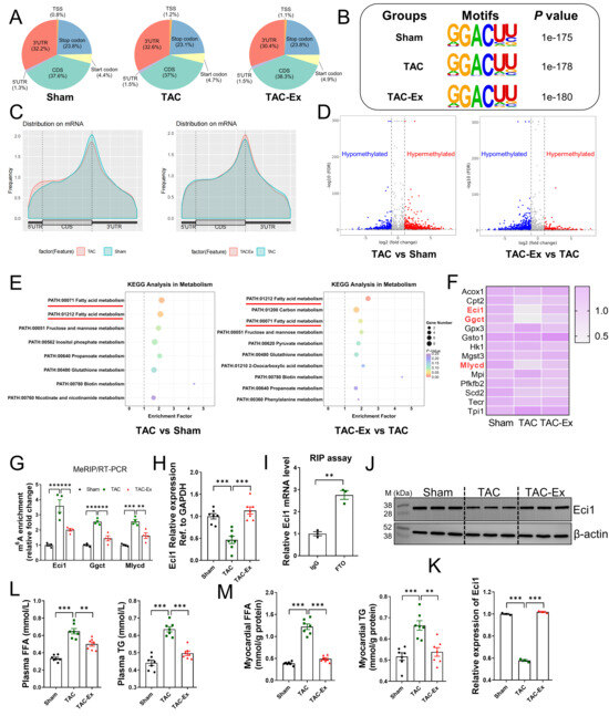 We performed a comprehensive transcriptome-wide analysis of m6A RNA methylation employing MeRIP-seq and RNA-seq. Our findings indicated an enrichment of m6A peaks within the 5′-untranslated regions, coding sequences, and 3′-untranslated regions (Figure 3A). The robustness of transcriptome data was confirmed by an unbiased motif search, which utilized the identified m6A peaks as input and successfully identified the previously reported m6A consensus sequence, DRACH (Figure 3B). Quantitative analysis of m6A peaks across all transcripts revealed a distribution pattern with a notable enrichment of m6A near the translation termination site (Figure 3C). Additionally, differential m6A methylation peaks and their statistical significance were assessed using MeTDiff software [39]. The MeRIP-seq analysis identified both hypomethylated and hypermethylated m6A peaks between the two comparative groups (Figure 3D). Prior studies have established that energy metabolism disorders are primary risk factors for the onset of cardiovascular diseases, leading to cardiac dysfunction [40,41]. Subsequently, we conducted a KEGG pathway analysis on the differentially methylated transcripts to explore their involvement in metabolic pathways. Among the metabolic pathways analyzed, those related to fatty acid metabolism displayed distinct differences between the two comparative groups (Figure 3E). Figure 3F presents a heatmap of the expression levels of all genes identified within the fatty acid metabolism pathway, encompassing a total of 14 genes. These expression levels, quantified as FPKM values, were obtained from RNA-seq data. Notably, the genes Eci1, Ggct, and Mlycd were significantly downregulated and hyper-methylated in the TAC group, while being upregulated and hypo-methylated in the TAC-Ex group. These observations from MeRIP-seq data were validated by MeRIP-qPCR assays, as shown in Figure 3G. Based on relative enrichment, Eci1, which exhibited the highest differential fold change, was selected for further analysis. Furthermore, the expression of Eci1 across the three groups was confirmed using qRT-PCR and Western blot assays (Figure 3H,J,K). Our results indicate that TAC treatment significantly decreased the production of Eci1 protein, whereas exercise intervention resulted in an elevation of Eci1 protein levels (Figure 3J). Additionally, RIP analysis revealed that FTO can bind to Eci1 mRNA (Figure 3I), suggesting its role as the m6A demethylase for Eci1. Eci1 is crucial in mitochondrial function by facilitating β-oxidation through the catalysis of unsaturated fatty acids. Subsequent observations revealed a significant increase in the levels of FFA and TG in both plasma and myocardial tissues within the TAC-induced heart failure model group. Notably, these alterations were reversed following the exercise intervention (Figure 3L,M). These findings suggest an association between abnormal lipid metabolism and Eci1. Eci1 may serve as a potential target for FTO, warranting further investigation.