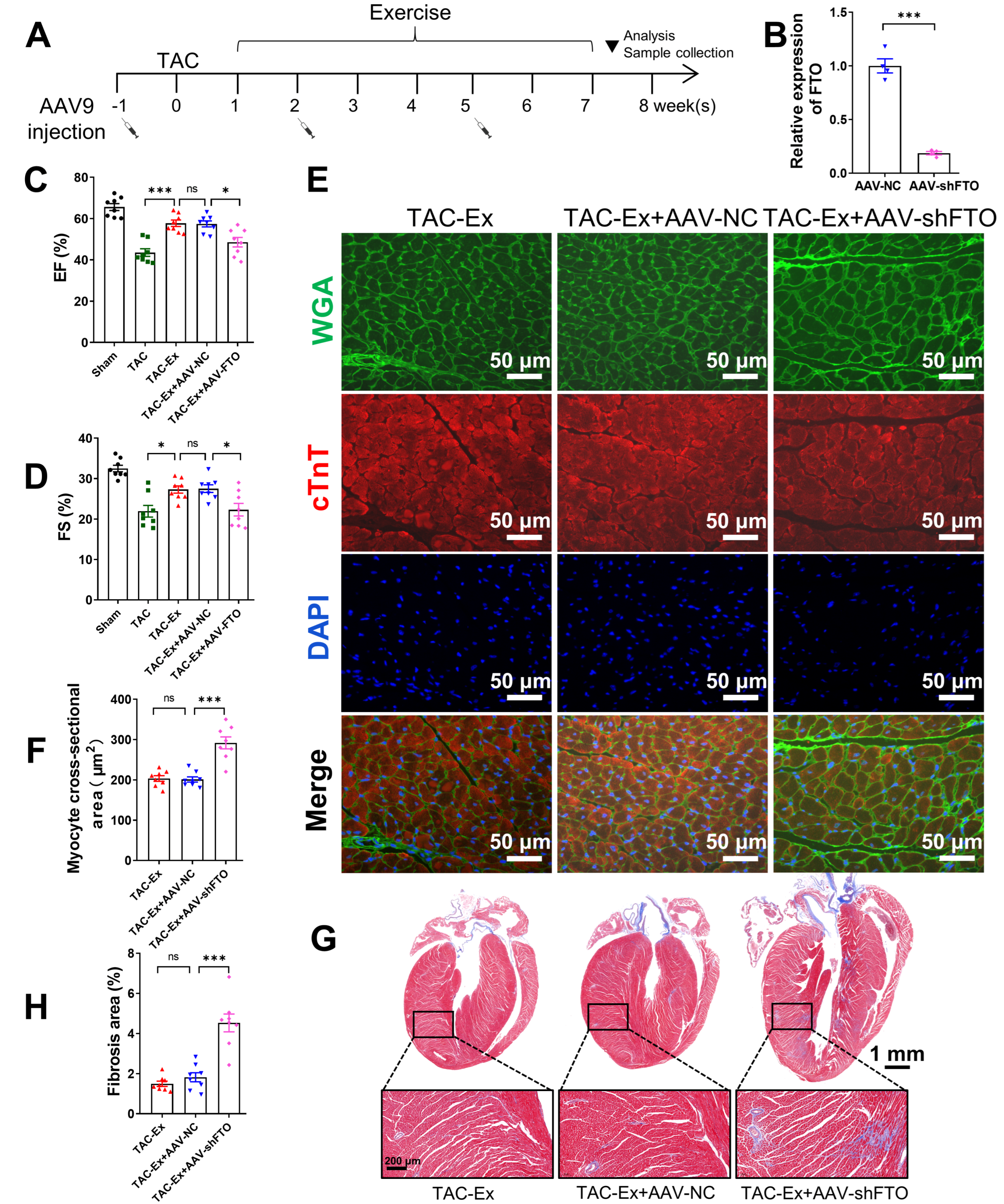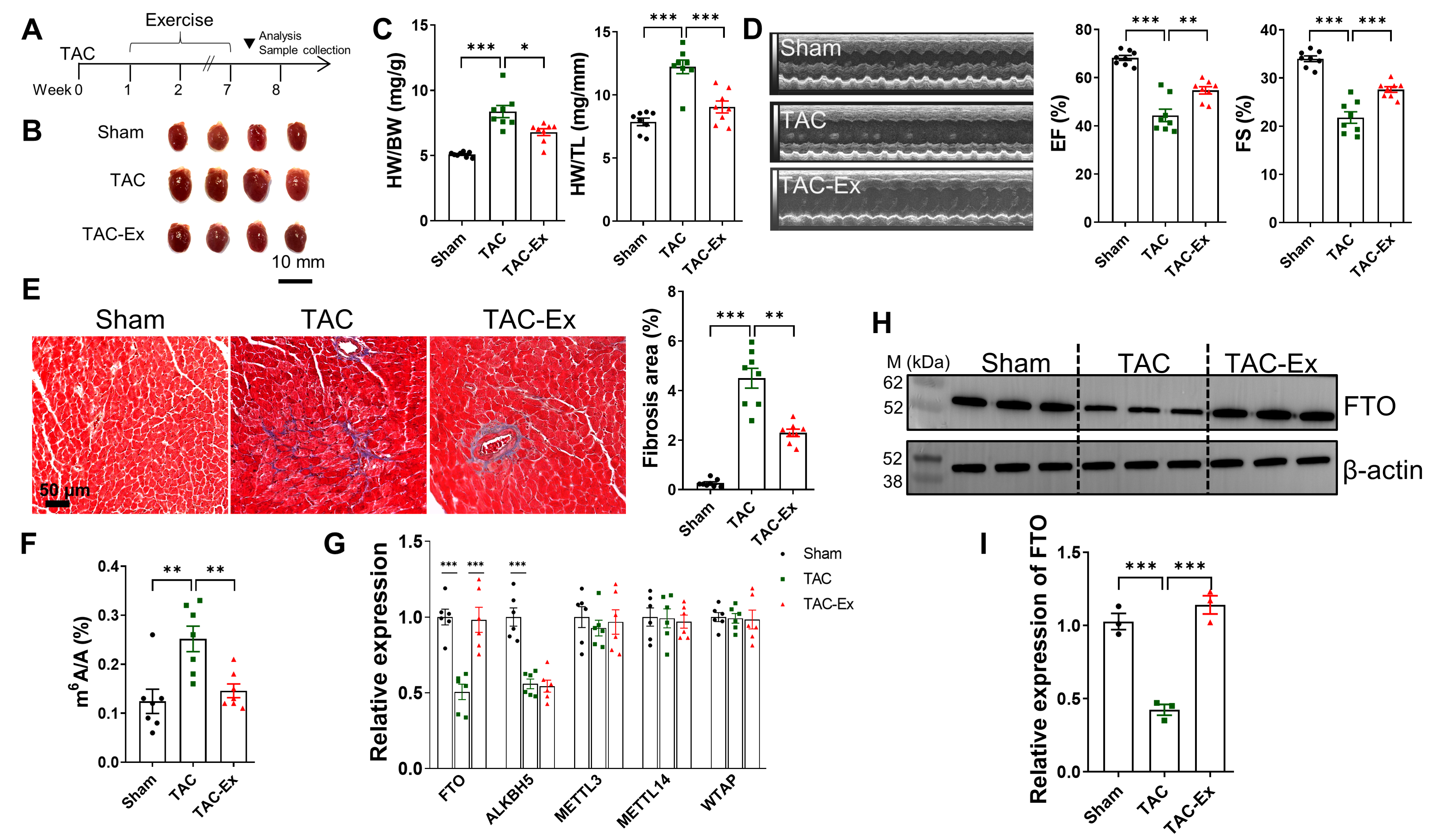 3.1. Exercise Intervention Attenuates TAC Induced Heart Failure and Inhibits the m6A Methylation by Increasing FTO Expression