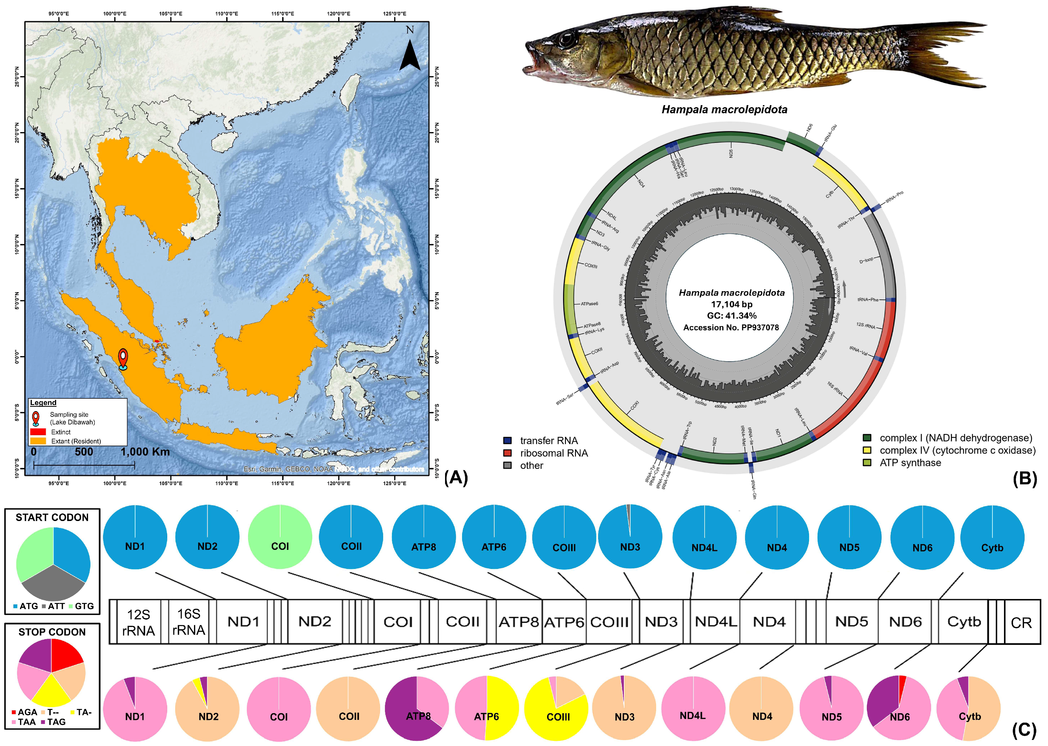 - Liu, M.; Huang, F.; Liu, S. The mitochondrial genome of Hampala macrolepidota (Cypriniformes, Cyprinidae). Mitochondrial DNA 2015, 26, 807–808. [Google Scholar] [CrossRef] [PubMed]