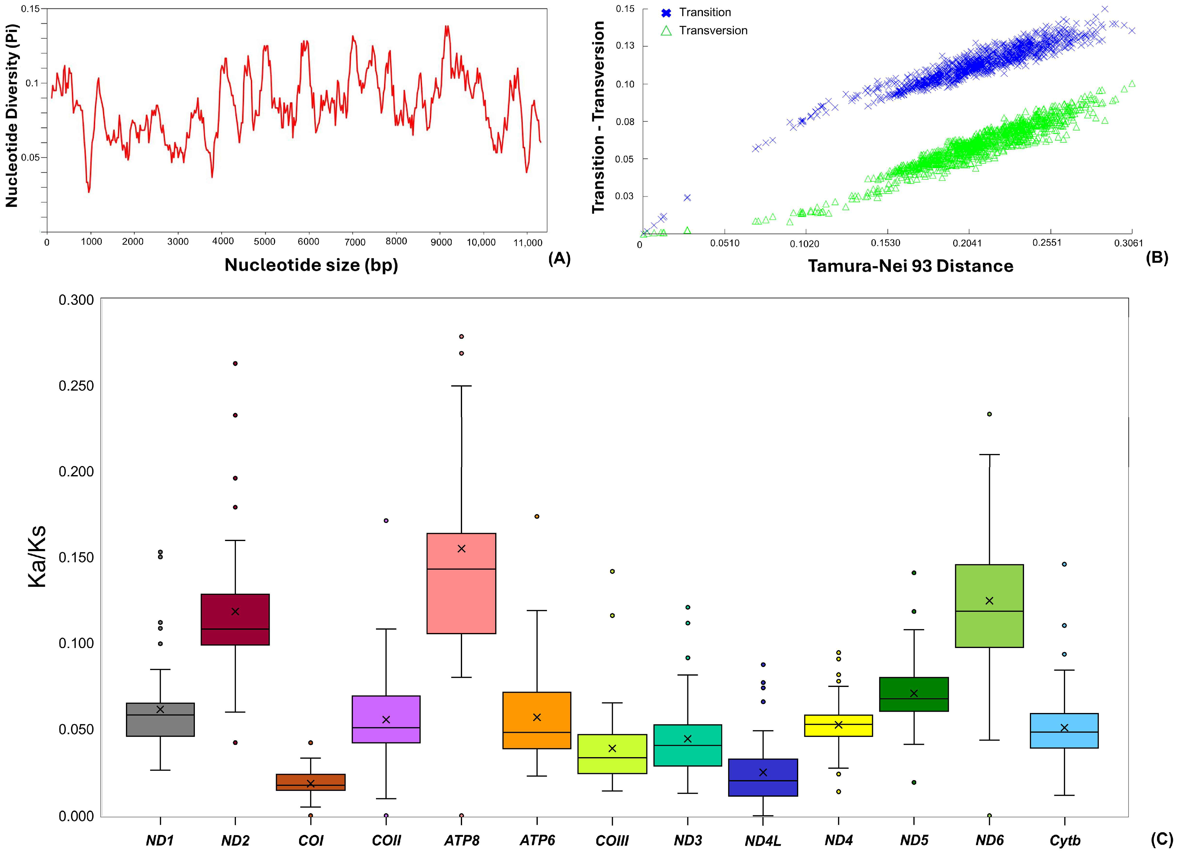 - Perna, N.T.; Kocher, T.D. Patterns of nucleotide composition at fourfold degenerate sites of animal mitochondrial genomes. J. Mol. Evol. 1995, 41, 353–358. [Google Scholar] [CrossRef]