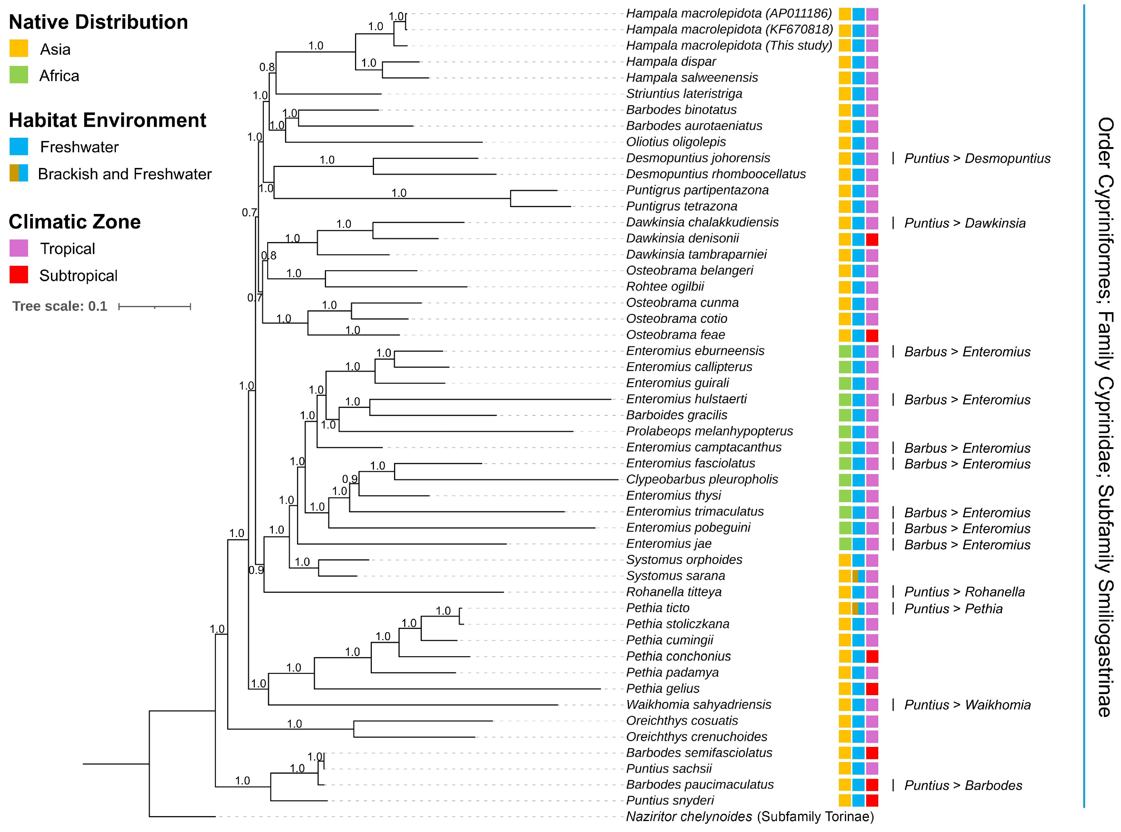 - Ren, Q.; Yang, L.; Chang, C.H.; Mayden, R.L. Molecular phylogeny and divergence of major clades in the Puntius complex (Teleostei: Cypriniformes). Zool. Scr. 2020, 49, 697–709. [Google Scholar]