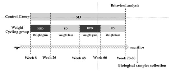 - Weight Cycling Group (n = 7, 3 males and 4 females): subjected to two consecutive diet cycles, each consisting of a high-fat diet (HFD; SAFE 260HF, Augy, France) period (weight-gain phase) followed by a standard diet (SD; SAFE A04, Augy, France) period (weight-loss phase).