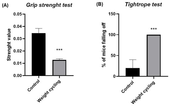 Physical condition assessment in Control and Weight Cycling Groups. (A) Grip strength test. (B) Tightrope test. Each column represents the mean ± SEM of the values determined in 5 animals from Control Group and 7 animals from Weight Cycling Group. *** p < 0.001, compared to the Control Group value (Student’s t-test). ES for grip strength test = 3.79; ES for tightrope test = 2.83.