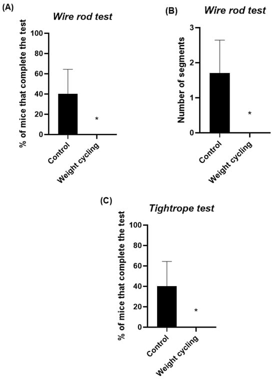 Assessment of sensorimotor performance in Control and Weight Cycling Groups. (A) Balance evaluation using the wire rod test. (B) Coordination assessment using the wire rod test. (C) Coordination evaluation through the tightrope test. Each column represents the mean ± SEM of the values determined in 5 animals from Control Group and 7 animals from Weight Cycling Group. * p < 0.05, compared to the Control Group value (Student’s t-test). ES for % of mice that complete the test in the wire rod test = 1.15; ES for number of segments = 1.27; ES for % of mice that complete the test in the tightrope test = 1.15.
