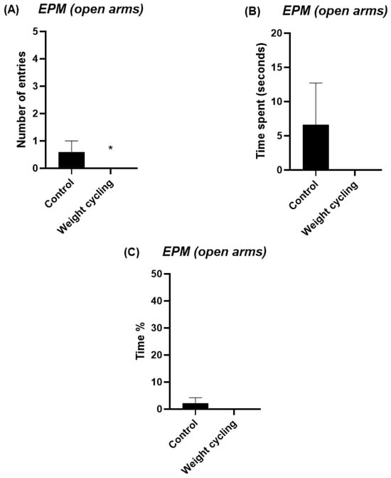 Assessment of anxiety-like behavior in Control and Weight Cycling Groups using the elevated plus maze test. (A) Number of entries into the open arms. (B) Time spent in the open arms (seconds). (C) Percentage of time spent in the open arms. Each column represents the mean ± SEM of the values determined in 5 animals from the Control Group and 7 animals from the Weight Cycling Group. * p < 0.05, compared to the Control Group value (Student’s t-test). ES for number of entries = 1.06; ES for time spent = 0.76; ES for time % = 0.76.