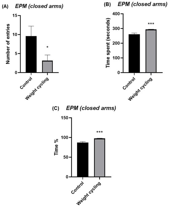 Assessment of anxiety-like behavior in Control and Weight Cycling Groups using the elevated plus maze test. (A) Number of entries into the closed arms. (B) Time spent in the closed arms (seconds). (C) Percentage of time spent in the closed arms. Each column represents the mean ± SEM of the values determined in 5 animals from the Control Group and 7 animals from the Weight Cycling Group. * p < 0.05, *** p < 0.001, compared to the Control Group value (Student’s t-test). ES for number of entries = 1.35; ES for time spent = 2.65; ES for time % = 2.65.