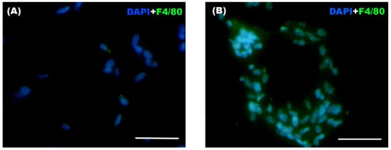 For the immunofluorescence technique, slides containing the adipose tissue samples were washed with PBS + Triton X-100 (Merck KGAa, Darmstadt, Germany) and then fixed with 4% PFA for 5 min. After a series of washes with PBS + Triton X-100 and with PBS + gelatin (PanReac AppliChem, Barcelona, Spain) + Triton X-100, non-specific binding sites were blocked with PBS + gelatin + Triton X-100 + lysine (Merck KGAa, Darmstadt, Germany) for 1 h. Finally, F4/80 (Alexa Fluor® 488 Anti-mouse F4/80 Antibody, BioLegend, San Diego, CA, USA) antibody was added at concentrations determined after titration. The samples were then incubated overnight in a humid chamber in darkness. The next day, slides were washed again with PBS + Triton X-100 and with PBS + gelatin + Triton X-100. DAPI 2 μM (PanReac AppliChem, Barcelona, Spain) was added as a nuclear stain. After 15 min of incubation, the slides were washed with PBS. Coverslips and Mowiol® 40-88 (Sigma-Aldrich, Darmstadt, Germany) were used for mounting the samples. The samples were stored at 4 °C in a humid chamber in darkness until they were visualized under the fluorescence microscope for the counting of infiltrated macrophages in the adipose tissue.