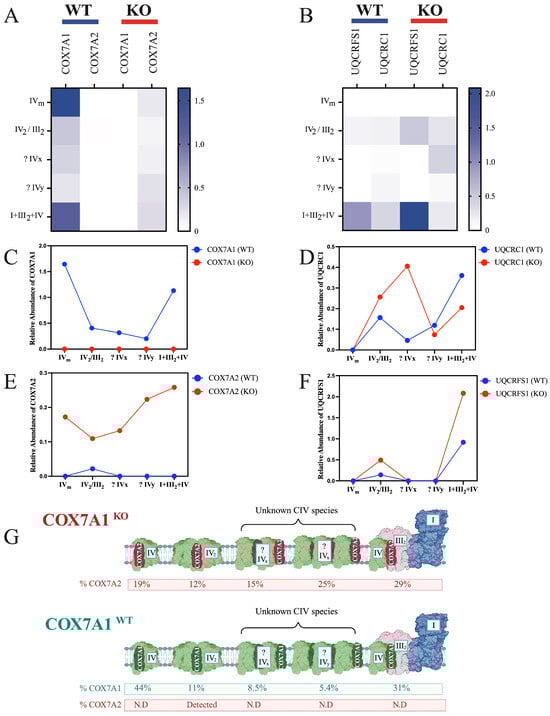 Structural compensation and redistribution of COX7A2 in COX7A1 knockout mice. (A) BN-PAGE followed by proteomic analysis, illustrating the relative distribution of COX7A1 and COX7A2. The total intensity was normalized to the COXIV subunit within each gel band. (B) BN-PAGE followed by proteomic analysis, illustrating the relative distribution of UQCRFS1 and UQCRC1. The total intensity was normalized to the UQCRC2 subunit within each gel band. (C,E) Relative abundance comparison of COX7A1 and COX7A2, based on data shown in (A). (D,F) Relative abundance comparison of UQCRC1 and UQCRFS1, based on data shown in (B). (G) Summary schematic of data derived from (A–F). Not detected annotated as N.D.