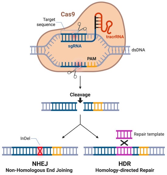 Schematic overview of CRISPR-Cas9-mediated genome editing. Cas9 introduces a site-specific double-strand break in the target DNA. In the absence of an exogenous repair template, the break is predominantly repaired by non-homologous end joining (NHEJ), frequently resulting in insertions or deletions (InDels) that can disrupt gene function. In the presence of a homologous repair template, the break can be repaired through homology-directed repair (HDR), enabling the precise introduction of defined genetic modifications. Figure created in BioRender BETA. Odabas, M. (2026) https://BioRender.com/k6d4x83 (accessed on 26 January 2026).