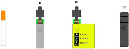 E-cigarettes are composed of a mouthpiece, a battery, an e-liquid container, and a heater (Figure 1). The latter is a metal wire wrapped around a piece of cotton wool that heats up when electricity flows through it. The cotton wool is continuously saturated with e-liquid from the tank, which is released in the form of an aerosol when it comes into contact with the heated metal [20]. The activation of the mechanism is contingent upon the specific model and manufacturer. In some cases, the mechanism is activated automatically upon the detection of airflow through the mouthpiece. In other cases, the mechanism is activated manually through the pressing of a button. E-cigarettes can be categorized into two distinct classifications: open and closed systems. The adaptability of open systems allows for the addition of e-liquid of diverse flavor profiles and nicotine concentrations, the adjustment of voltage and power settings, and the replacement of heaters and batteries as necessary (Figure 1A). Closed systems refer to devices in which entire cartridges (refills) are replaced, that is to say, e-liquid containers with a built-in heater. Closed systems also include disposable e-cigarettes, which are characterized by the absence of replaceable components (Figure 1B) [17,18,19].