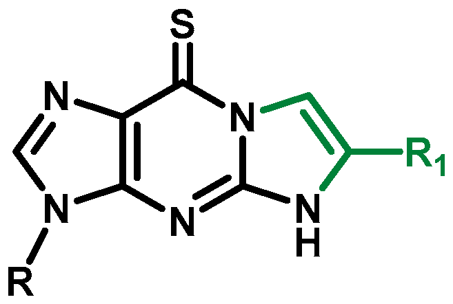 - Krancewicz, K.; Taras-Goslinska, K.; Nowicka-Bauer, K.; Fiedorowicz, K.; Marciniak, B. Thiopurines Analogues with Additional Ring: Synthesis, Spectroscopic Properties, and Anticancer Potency. Int. J. Mol. Sci. 2023, 24, 8990. [Google Scholar] [CrossRef] [PubMed]