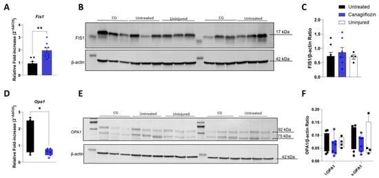 Mitochondrial Fission and Fusion Markers. (A) Fis1 Gene Expression. Relative mRNA fold-change showing a significant increase in the mitochondrial fission marker Fis1 in CG-treated animals compared to untreated. All data normalized to uninjured controls (n = 4). (B-C) FIS1 Protein Analysis. Representative Western blot image (B) and quantitative densitometry (C) of FIS1 protein (17 kDa) normalized to β-actin (42 kDa). Original Western blot image can be found in Supplementary Materials. No significant differences were detected between the untreated (n = 8) and CG (n = 7) groups. (D) Opa1 Gene Expression. Relative mRNA fold-change showing that the fusion marker Opa1 is significantly attenuated in CG-treated animals compared to untreated. All data normalized to uninjured controls (n = 4). (E,F) OPA1 Protein Analysis. Western blot image (E) and quantitative densitometries (F) of OPA1 protein showing the 92 kDa long isoform (l-OPA1) and 75 kDa short isoform (s-OPA1) normalized to β-actin (42 kDa). Original Western blot image can be found in Suplementary Materials. A One-Way ANOVA revealed that no significant differences were detected between the uninjured control (n = 4), untreated (n = 8), and CG-treated (n = 7) groups. * p < 0.05; ** p < 0.01.