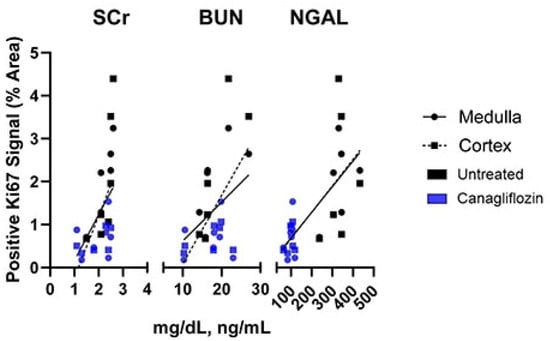 Correlative Analysis of Kidney Markers Serum Creatinine (SCr), Blood Urea Nitrogen (BUN), and Neutrophil gelatinase-associated lipocalin (NGAL) with Ki67 proliferation staining. Correlative analysis between Ki67 positive signal and SCr had a linear regression with equation y = 1.436x − 1.672 (Cortex, p = 0.041) and y = 1.068x − 0.9064 (Medulla, p = 0.054). BUN correlations had equations of y = 0.1596x − 1.514 (Cortex, p = 0.032) and y = 0.9038x − 0.2862 (Medulla, p = 0.14). NGAL correlations had equations of y = 0.006167x + 0.05166 (Cortex, p = 0.020) and y = 0.005962x + 0.09198 (Medulla, p = 0.0015).