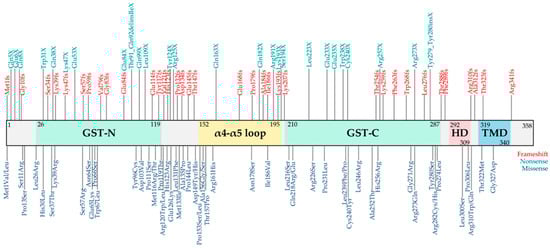 Schematic illustration of the GDAP1 protein domains highlighting the most significant clinical variants. Glutathione-S transferase (GST), hydrophobic domain (HD), transmembrane domain (TMD), and amino acid residues numbering are shown. The number indicates the amino acid position in GDAP1 protein. Clinical variants reported in ClinVar (last access 30 October 2025) were represented: frameshift (red), nonsense (green), and missense (blue).