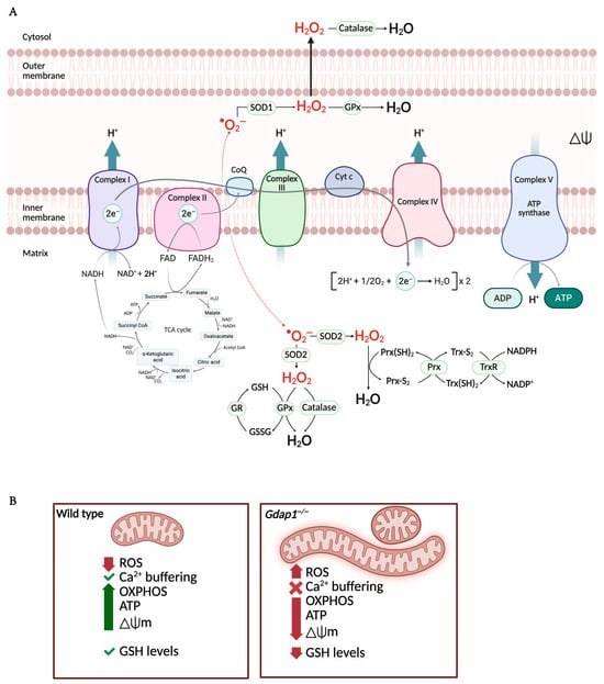 Mitochondrial oxidative phosphorylation and redox imbalance are altered in GDAP1-deficient cells. (A) The mitochondrial electron transport chain (ETC) comprises five protein complexes embedded in the inner mitochondrial membrane. The TCA cycle in the matrix provides NADH and FADH2 to fuel electron transfer, driving proton (H+) translocation into the intermembrane space. This generates the protonmotive force, or mitochondrial membrane potential (ΔΨ), which powers ATP synthesis via Complex V as protons flow back into the matrix. Reactive oxygen species (ROS) are generated at multiple ETC sites, primarily as superoxide (•O2−), which is converted to hydrogen peroxide (H2O2) by SOD1 and SOD2. Detoxification systems—including the glutathione peroxidase/reductase (GPx/GR) and peroxiredoxin/thioredoxin (Prx/TrxR) pathways, along with catalase—maintain redox balance within the matrix and cytosol. (B) In GDAP1 deficient cells, elongated and swollen mitochondria produce ROS, decreasing the OXPHOS, ATP production and the mitochondrial membrane potential. Moreover, the levels of cellular glutathione are also diminished, exacerbating oxidative stress. Abbreviations: ETC: electron transport chain; TCA: Tricarboxylic acid cycle; NADH: nicotinamide adenine dinucleotide (reduced); FADH2: flavin adenine dinucleotide (reduced); H+: proton; ATP: adenosine triphosphate; ROS: reactive oxygen species; •O2−: superoxide; H2O2: hydrogen peroxide; SOD1/2: Superoxide dismutase 1/2; GPx/GR: glutathione peroxidase/reductase; Prx/TrxR: peroxiredoxin/thioredoxin; OXPHOS: oxidative phosphorylation. Illustration created with BioRender. Lara Cantarero (2026). https://www.biorender.com/.