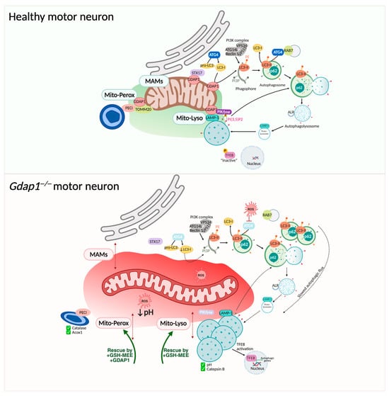 GDAP1 is localized at MAMs [12,15], and its deficiency reduces both the frequency and proximity of these contacts [13]. Additionally, the accumulation of autophagic vesicles has been reported in GDAP1-deficient cells, implicating disrupted basal autophagy in the pathophysiology of GDAP1-related CMT (Figure 8) [12,49]. During autophagy initiation, the Q-SNARE protein syntaxin 17 (STX17) recruits ATG14 to MAMs, facilitating autophagosome formation [87]. GDAP1 constitutively interact with STX17, suggesting a role in recruiting additional factors to MAMs to coordinate autophagosome biogenesis. The elongation of the phagophore and autophagosome closure depend on LC3 lipidation, where LC3 is covalently attached to phosphatidylethanolamine (PE) through ubiquitin-like enzymatic reactions. Mitochondria, as the main PE source, and MAMs, as sites of lipid synthesis and trafficking, are thus essential for this process [88]. GDAP1 interacts with LC3-I under basal conditions and with LC3-I/II when autophagy is induced or inhibited. Both LC3-I and LC3-II are found in ER and MAM fractions, supporting MAM-associated lipidation [12]. Notably, GDAP1 deficiency causes a significant reduction of LC3-I and LC3-II levels in MAM fractions, suggesting impaired lipidation at this critical site.
